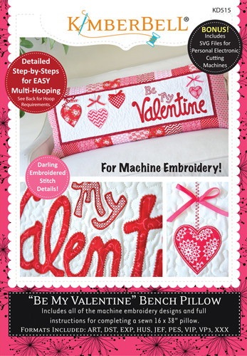 Loading... Please wait...Now you can MACHINE EMBROIDER Kimberbell’s popular series of interchangeable bench pillow covers! Start by making one large "bench pillow" form. Then change out a new cover for that pillow form for each season or holiday! Machine embroidery appliqués, instructions for making the pillow form, as well as the "Be My Valentine" cover are all included. Machine embroidery files for “piecing” the snowball blocks in the hoop are an added bonus! Detailed step-by-step instructions for multi-hooping make this a fun project to decorate your home!