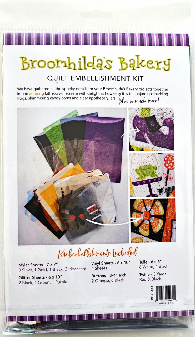 We have gathered all the spooky details for your Broomhilda's Bakery projects together in one amazing kit! You will scream with delight at how easy it is to conjure up sparkling frogs, shimmering candy corns and clear apothecary jars! Embellishment kit includes: (4) Sheets of Vinyl, (4) Sheets of Applique Glitter, (7) Sheets of Mylar, White & Black Tulle, (8) 3/4in Buttons, and 6 yards of Twine. Embellishment kit does not include fabric or felt.