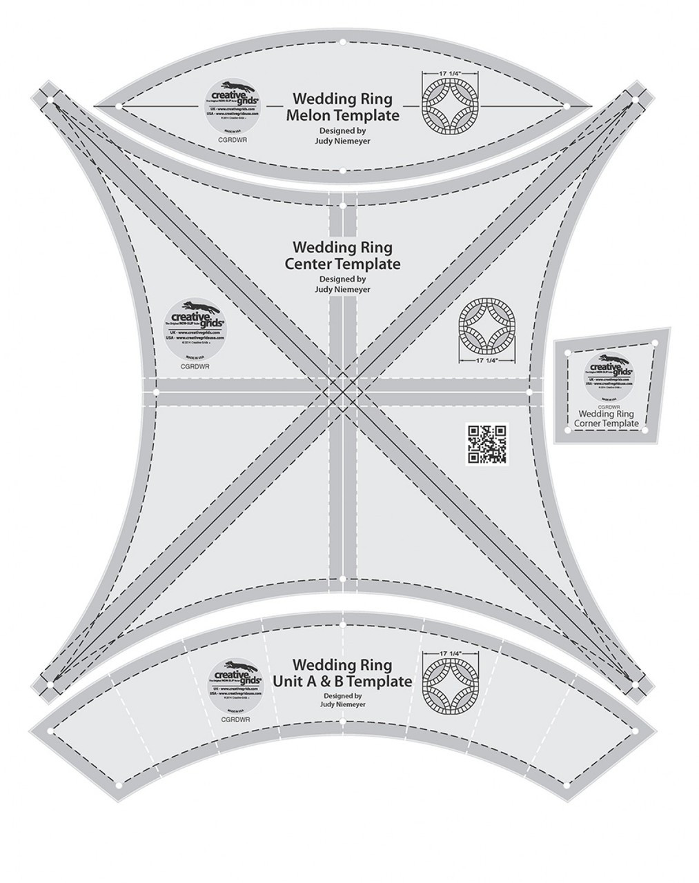 Loading... Please wait...This Double Wedding Ring four piece template set, designed by Judy Niemeyer, was designed to work with her double wedding ring patterns. Or use these 17-1/4 inch templates to cut the segments needed to create a double wedding ring quilt. Mark the fabric through the holes in the template to mark the center of the curved sides to make piecing a breeze. All of the curves can be cut with a 45 or 60mm rotary cutter.