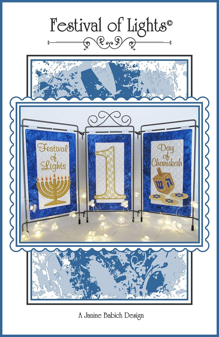 Loading... Please wait...Celebrate the eight day Jewish Festival of Lights and count the days of Chanukah with this bright, interactive table top display. Pattern contains 8 appliqued numbers and two filler panels. Finished size when displayed in a trip tic stand: 16" wide x 11" tall. CD includes embroidery formats: ART, ART8, EMB, EXP, DST. HUS, JEF, PCS, PES, SEW, SHV, VP3 & XXX. Bernina cutwork tool friendly design. JPEG & SVG images included. Requires a 5 3/4" x 8" hoop.