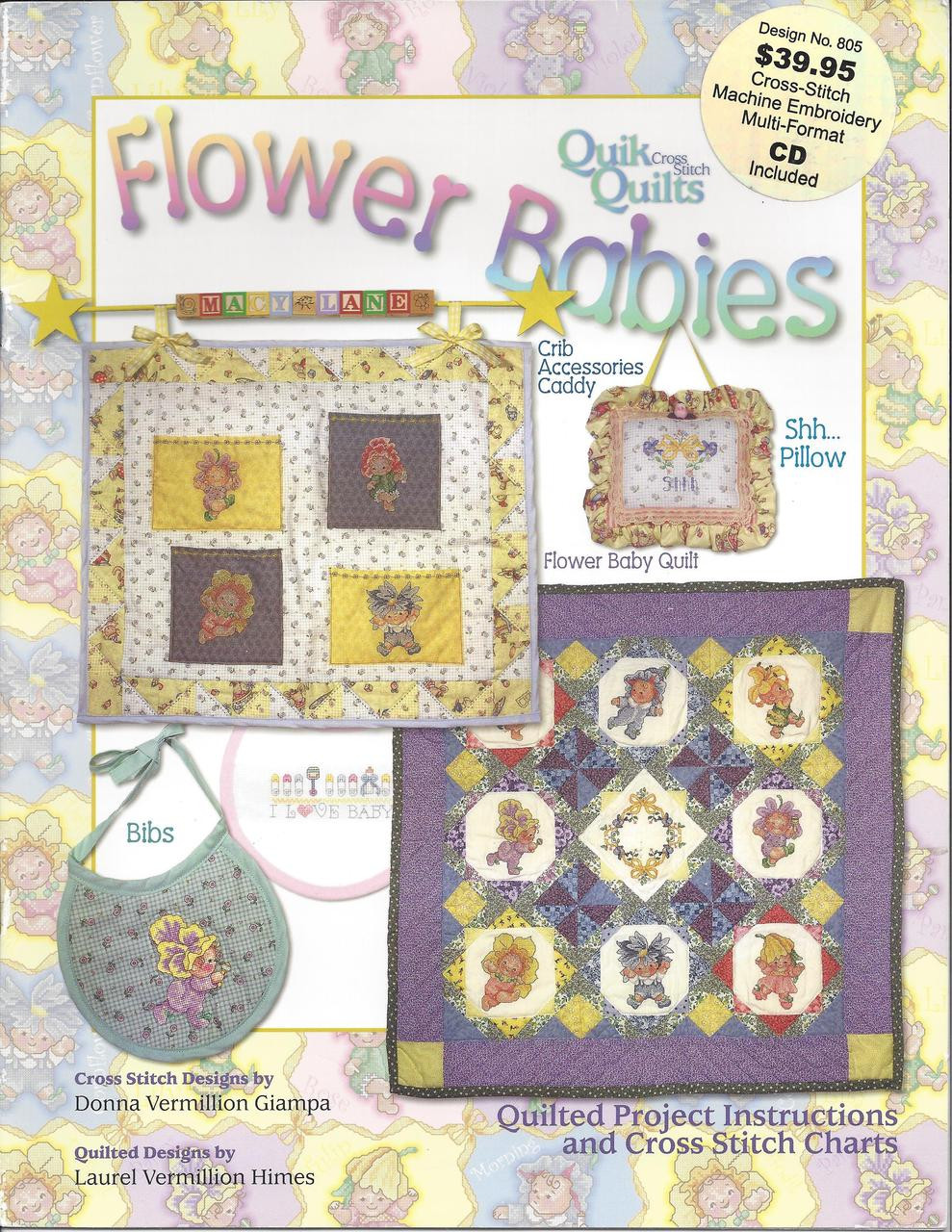 Vermillion Stitchery'ssecond book in the Quik Cross Stitch Quilts series. Includes full color charts for the quilted projects includingthe cross stitch designs for hand stitchers and a CD is also included for machine embroidery. Projects include flower babies quilt, crib caddy, bow border door hangar, baby bibs, greeting cards and 12 stitch charts. Book is 12 pages. CD includes formats: .art, .hus, .jef, .pes, .vip, .xxx
