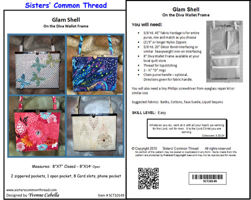 Loading... Please wait...Clever purse created on the Diva Wallet Frame (SMC223F). 8in x 7in closed, 8in x 14in open. 2 zipper pockets, 1 open pocket, 8 credit card slots, cell phone pocket. Many possibilities for blinging and fabric choices. Options for chain or fabric handle. Funky or sophisticated. Use cotton fabric, faux suede, how about brocade for an evening bag. Great small project for embroidering or hand applique on the front. Endless choices.