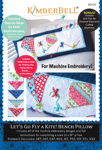 Loading... Please wait...Now you can MACHINE EMBROIDER Kimberbell’s popular series of interchangeable bench pillow covers! Start by making one large "bench pillow" form. Then change out a new cover for that pillow form for each season or holiday! Machine embroidery appliques, instructions for making the pillow form, as well as the “Let’s Go Fly a Kite” cover are all included. Also includes embroidery files to “piece” those “Flying Geese” border blocks, in-the-hoop! Detailed step-by-step instructions for multi-hooping make this a fun project to decorate your home!