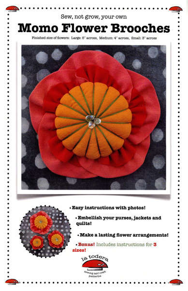 Loading... Please wait...We just like to say it, “Momo, momo, momo..,“ but Momo actually means ‘peach’ in Japanese! This peach blossom brooch is a showstopper, with a double row of petals and a graphic center. Momo Flower Brooches look great on everything from a jean jacket to a purse to a wedding dress! How about embellishing an art quilt or craft project? Pattern includes large size: 5” across, medium: 4” across, and small: 3” across. Easy to follow photo instructions make this pattern simple to make. No sewing machine required- take this project with you on the go!