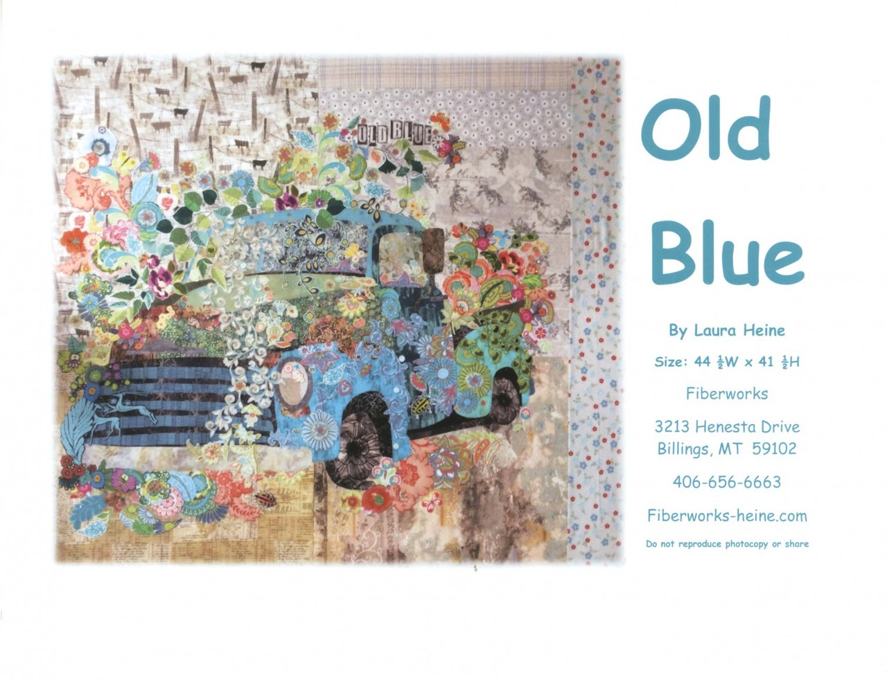 Old Blue vintage truck collage pattern by Laura Heine includes full sized patterns and step by step color instruction on how to complete the quilt. Fused applique. Size 44 1/2 x 45 1/2.