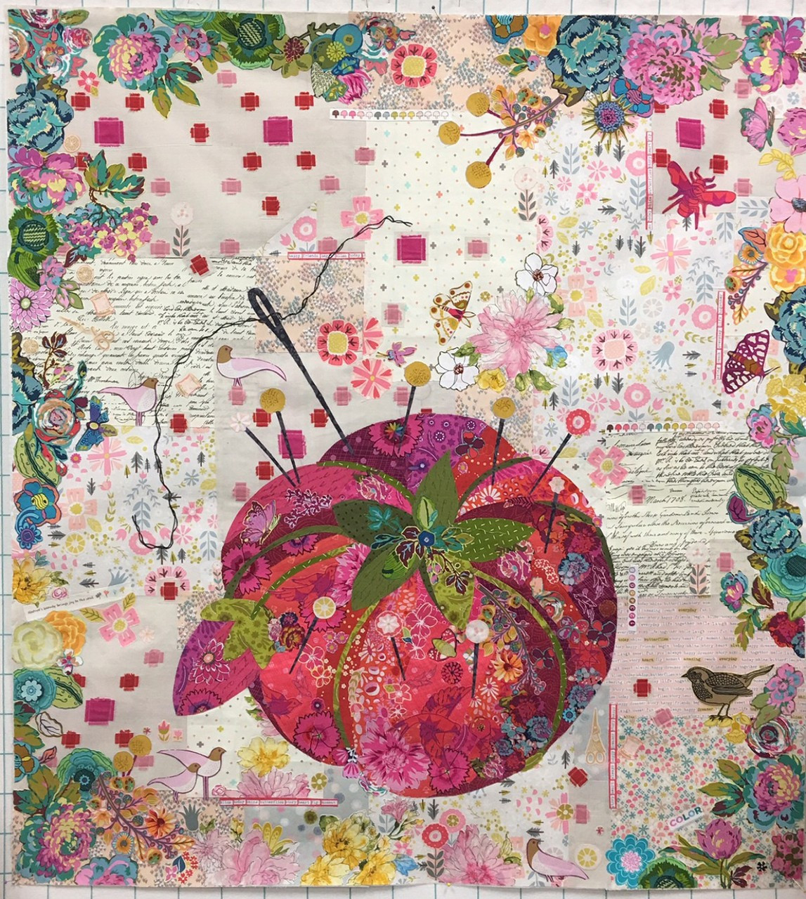 Laura Heine's Pincushion collage pattern. Full size pattern and complete instructions included. Finished size 41x45.