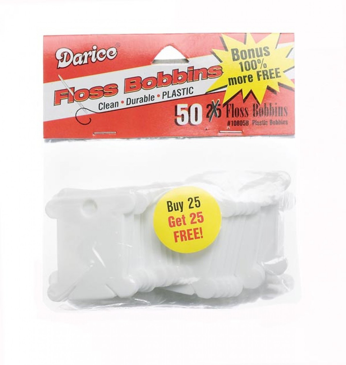 Plastic floss bobbins. Perfect to use to keep thread organized and untangled! Bonus package, buy 25 get 25 free! 50 pieces per package from Darice.