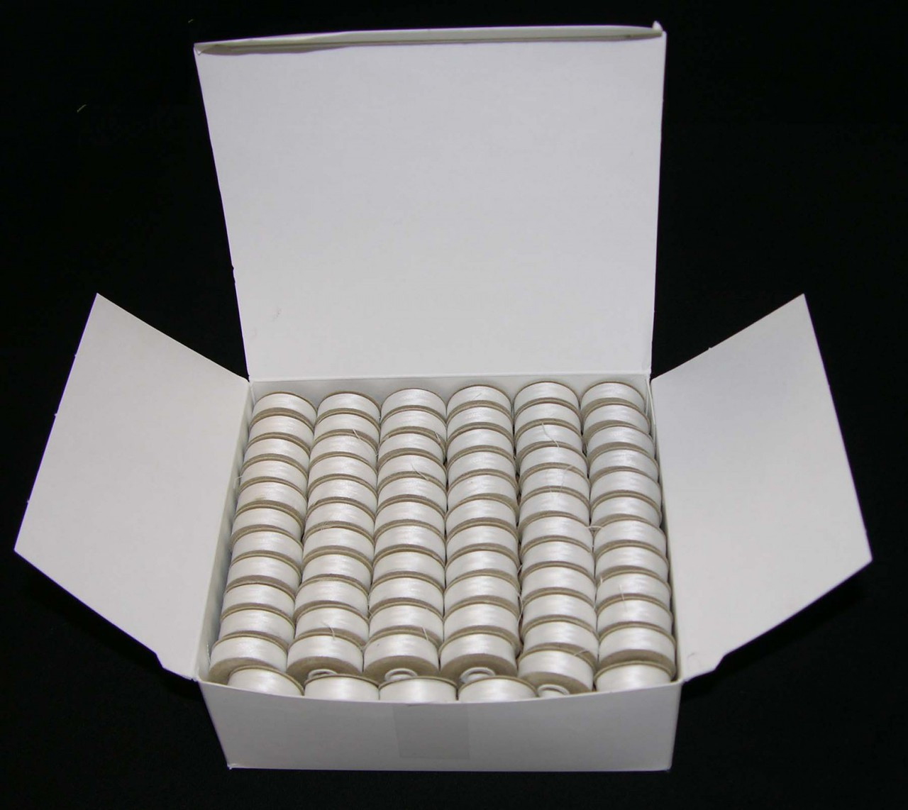 Each cardboard bobbin in this one gross box has 132 yards of thread on it. Thread is a Tex16. L style bobbins will fit in most home machines.