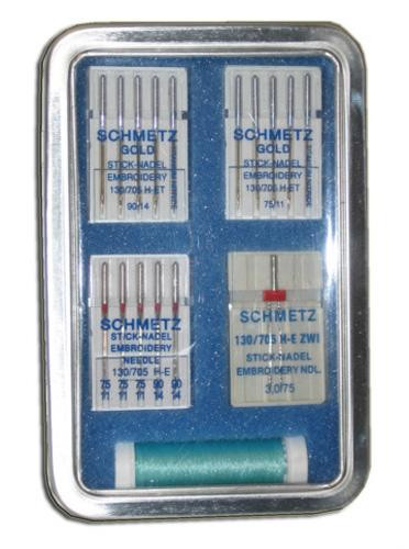Loading... Please wait...Includes one package of each Embroidery Gold 75/11, Embroidery Gold 90/14, Embroidery Assorted, Embroidery Twin 3.0/75, one sample spool Sulky PolyLite, one Schmetz ABC pocket guide and 3.7 x 5.5 reusable hinged storage tin.