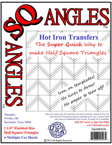 Multiple use hot iron transfer templates. The Super Quick way to make Half-Square Triangles! No lines to draw and no paper to tear off- Quick Easy and Accurate. 6 multiple use sheets in package To use simply iron template on to wrong side of fabric, place fabrics together right sides together sew on stitching lines, cut on solid lines, press open and start piecing! SQangles are sold by the Finished size- the size it is after it is sewn into the block. To determine what size SQangles to buy- check your pattern for the FINISHED size it requires. If you prefer room to square it up- use the next larger sizes. Transfer ink is permanent on most fabrics.