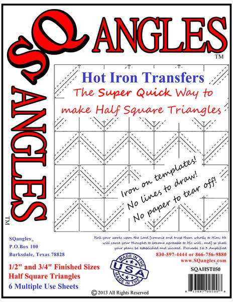 Loading... Please wait...Multiple use hot iron transfer templates. The Super Quick way to make Half-Square Triangles! No lines to draw and no paper to tear off- Quick Easy and Accurate. 6 multiple use sheets in package To use simply iron template on to wrong side of fabric, place fabrics together right sides together sew on stitching lines, cut on solid lines, press open and start piecing! SQangles are sold by the Finished size- the size it is after it is sewn into the block. To determine what size SQangles to buy- check your pattern for the FINISHED size it requires. If you prefer room to square it up- use the next larger sizes. Transfer ink is permanent on most fabrics.