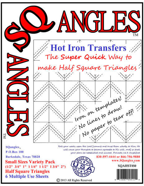 Loading... Please wait...Multiple use hot iron transfer templates. The Super Quick way to make Half-Square Triangles! No lines to draw and no paper to tear off- Quick Easy and Accurate. 6 multiple use sheets in package To use simply iron template on to wrong side of fabric, place fabrics together right sides together sew on stitching lines, cut on solid lines, press open and start piecing! SQangles are sold by the Finished size- the size it is after it is sewn into the block. To determine what size SQangles to buy- check your pattern for the FINISHED size it requires. If you prefer room to square it up- use the next larger sizes. Transfer ink is permanent on most fabrics. Small Size Variety Pack includes 1/2", 3/4", 1", 1-14", 1-1/2", 1-3/4" and 2" sizes