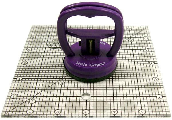 At only 2 1/4 in diameter, the perfect size for use with your smaller templates. The heart shaped handle fits two fingers perfectly & it has a single strong suction cup with the handy lock and release lever. Just press to any plastic ruler with a smooth surface, then flip the lever to lock in place. When you need to switch to another ruler, just flip the locking lever to release. It will work on any smooth surface rulers at least 3 wide that don't have any slots or holes in the areas that will be covered by the suction cup.