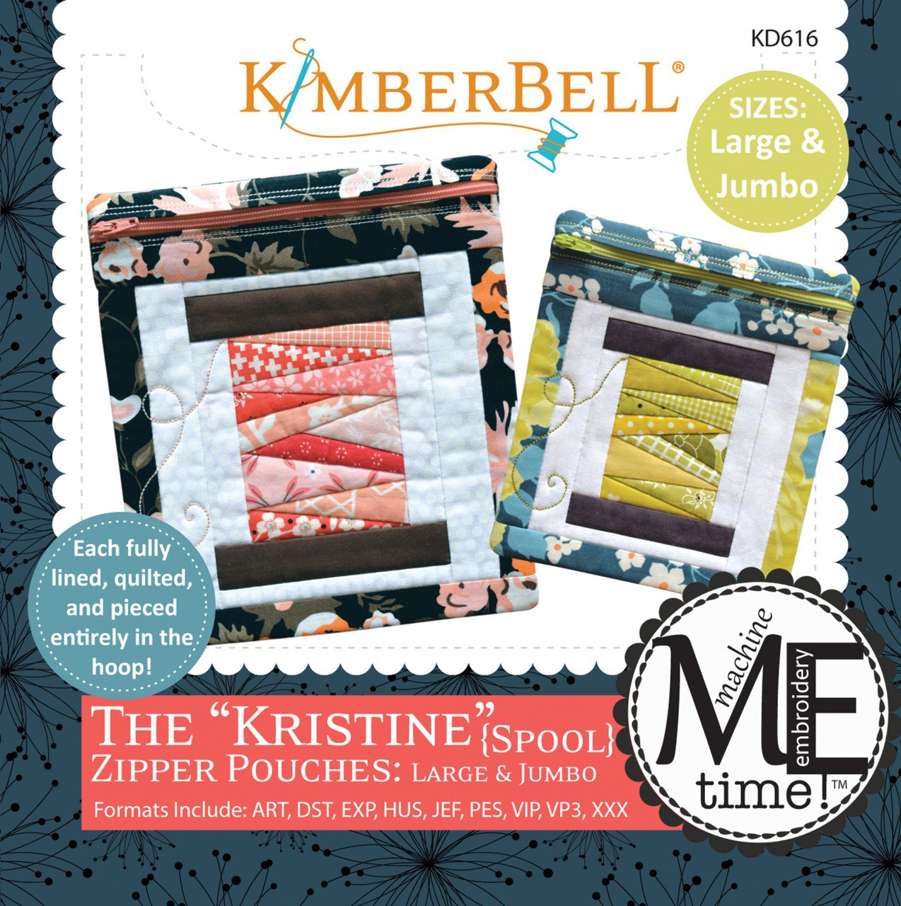 Loading... Please wait...The “Kristine” zipper pouch includes piecing and quilting — all in one hoop! Each has a pieced “spool” and the zipper pouch is lined and shows no raw seams or stabilizer! What a great way to showcase “piecing” in the hoop, as well as how fun and easy an in-the-hoop project can be!