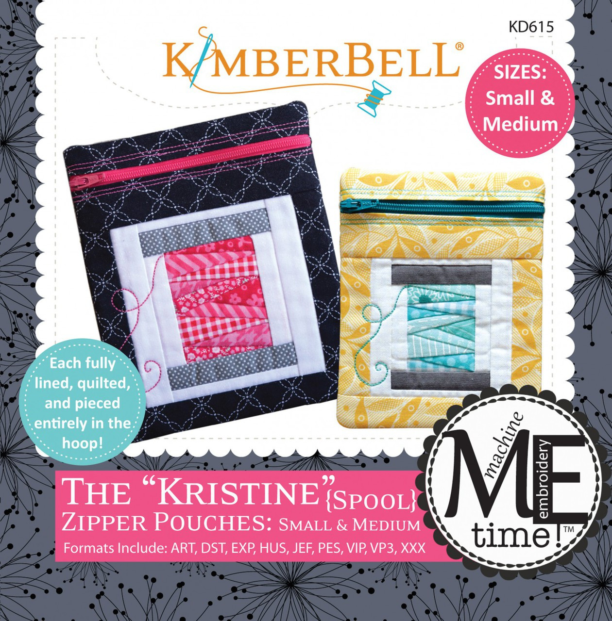 Loading... Please wait...The “Kristine” zipper pouch includes piecing and quilting — all in one hoop! Each has a pieced “spool” and the zipper pouch is lined and shows no raw seams or stabilizer! What a great way to showcase “piecing” in the hoop, as well as how fun and easy an in-the-hoop project can be!