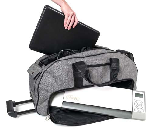 Loading... Please wait...Tote your Cameo in style and protect it too. The tote features a telescoping handle and wheels for easy rolling as well as handles for carrying. There is plenty of room for your Cameo as well as your laptop (up to 19 in) and accessories, too. Multiple compartments are padded and customizable and the dimensions are 25 in x 10 in x 12 in.