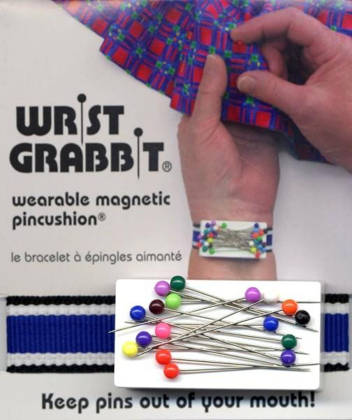 Wrist Grabbit magnetic pincushion keeps pins as close as your hand! The powerful magnetic platform on a wrist band sweeps up pins and aligns them with the heads ready to grab. Whether hemming or fitting, pins are ready at your fingertips!